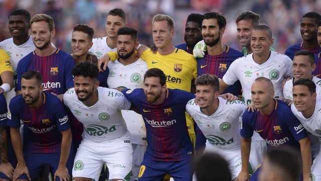 jogadores de Barcelona e Chapecoense abraçados diante de um coração verde no
